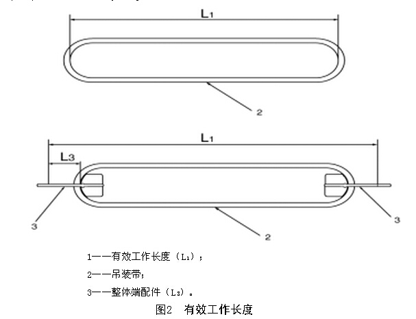 吊裝帶水平放置,并用手拉直時,用分度值為1mm的鋼卷尺或鋼直尺測量,其有效工作長度(EWL)L1(如圖2所示)偏差不應(yīng)超過名義長度的±2%。