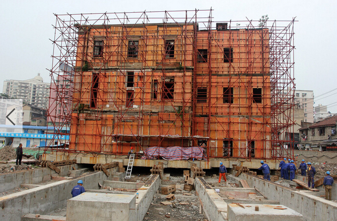 據(jù)了解,建筑物年代久遠,為了保證移動時不散架,必須要求基礎(chǔ)的加固工程做得更細致。水泥托盤是在房屋地基被掏空后,用液壓千斤頂將小樓抬高1.4米,用鋼筋混凝土澆筑而成。這樣,平移時的受力點也都在“托盤”上,而不在樓體建筑上。經(jīng)過反復(fù)推算,后將平移速度設(shè)置在每小時70厘米。