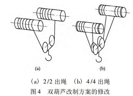 可知,當(dāng)鋼絲繩直徑和滑輪直徑確定后,鋼絲繩之間距離越大,能夠正常起升的大高度越高。這樣,可通過(guò)在吊鉤組水平方向增加滑輪的方式增大L值,來(lái)避免鋼絲繩纏絞的現(xiàn)象。雙葫蘆改制方案中的2 /2和4 /4出繩方案可變?yōu)閳D4所示的結(jié)構(gòu)。
