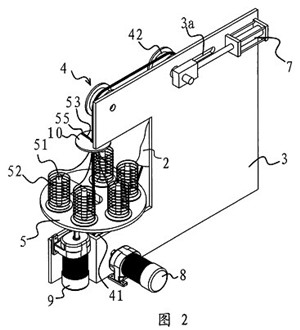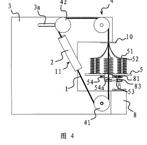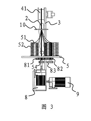 一種環(huán)形穿絲吊裝帶的生產(chǎn)裝置,它包括一塊固定板(3),在固定板(3)上設(shè)有用于撐開環(huán)形穿絲吊裝帶(11)的滾輪組(4),滾輪(41)驅(qū)動裝置與其中至少一個滾輪(41)相聯(lián)并可通過該滾輪(41)帶動環(huán)形絲吊裝帶(11)轉(zhuǎn)動,其特征在于,所述的固定板(3)的側(cè)部設(shè)有一個轉(zhuǎn)盤(5),在轉(zhuǎn)盤(5)上設(shè)有若干個用于放置線團(tuán)(52)的線架(51),轉(zhuǎn)盤(5)具有一個供撐開在滾輪組(4)上的環(huán)形穿絲吊裝帶(11)進(jìn)入并垂直穿過轉(zhuǎn)盤(5)中心的缺口(53),上述轉(zhuǎn)盤(5)與一個當(dāng)撐開在滾輪(41)組(4)上的環(huán)形穿絲吊裝帶(11)轉(zhuǎn)動時可帶動轉(zhuǎn)盤(5)上的各個線架(51)繞環(huán)形穿絲吊裝帶(11)轉(zhuǎn)動的轉(zhuǎn)盤(5)驅(qū)動裝置相聯(lián)接,所述的轉(zhuǎn)盤(5)驅(qū)動裝置包括一個與電機一(8)相聯(lián)的主驅(qū)動齒輪(81),在轉(zhuǎn)盤(5)的底部中心設(shè)有一個與主驅(qū)動齒輪(81)相嚙合的轉(zhuǎn)動齒輪(54),轉(zhuǎn)動齒輪(54)具有與轉(zhuǎn)盤(5)上的缺口(53)上下對應(yīng)的開(54a),在轉(zhuǎn)動齒輪(54)旁還設(shè)有一個副驅(qū)動齒輪(82),所述的副驅(qū)動齒輪(82)通過同步傳動帶(83)與主驅(qū)動齒輪(81)相連。