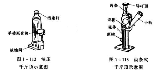 棘輪手柄由棘輪、棘輪卡、手柄套筒組成。還有一種傘齒輪式螺旋千斤頂,如圖1-111所示。扳動操作手柄,經(jīng)過傘形齒輪傳動,將千斤頂升起,這種千斤頂上還裝有一個換向扳鈕,可控制千斤頂?shù)纳蛯ⅰB菪皫讍尉凶枣i作用,所以重物不會因停止操作而突然下降,也無漏油等故障問題,維護(hù)保養(yǎng)也較方便,能在垂直、橫臥或倒放等幾種位置狀況下使用。使用的有5、10、15、30、50t等規(guī)格。手柄操作力有十多公斤到幾十公斤不等,由1-3人操作。