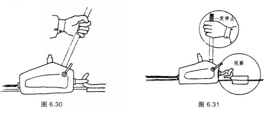 ⑧鋼絲繩固定端,必須確認(rèn)其穩(wěn)定程度或強(qiáng)度,為此,在扳動(dòng)前進(jìn)桿使被牽引物體剛剛受力時(shí)要一度停止扳動(dòng),觀察固定端及鋼絲繩有無(wú)異常,確認(rèn)無(wú)異常后方可繼續(xù)操作,如圖6.31所示。