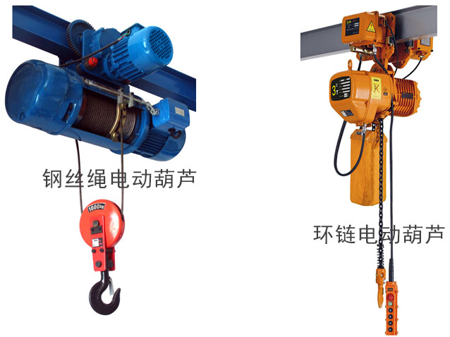 電動(dòng)葫蘆按其結(jié)構(gòu)形式可分為環(huán)鏈?zhǔn)诫妱?dòng)葫蘆和鋼絲繩式電動(dòng)葫蘆。環(huán)鏈?zhǔn)诫妱?dòng)葫蘆是用環(huán)狀焊接鏈與吊鉤連接作起吊索具之用。因起升高度較低,廣泛用于低矮廠房或露天環(huán)境。而鋼絲繩電動(dòng)葫蘆是用鋼絲繩與串鉤連接作起吊索具之用。