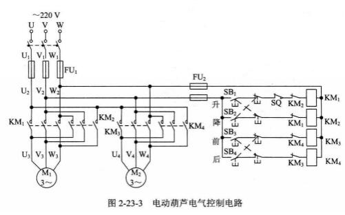 如圖2-23-3所示為電動葫蘆電氣控制電路圖。提升電動機M1由上升、下降接觸器KM1、KM2控制,移動電動機M2由向前、向后接觸器KM3、KM4控制。它們都由電動葫蘆懸掛按鈕站上復(fù)式按鈕SB1-SB4實現(xiàn)電動控制,SQ為提升行程開關(guān)。