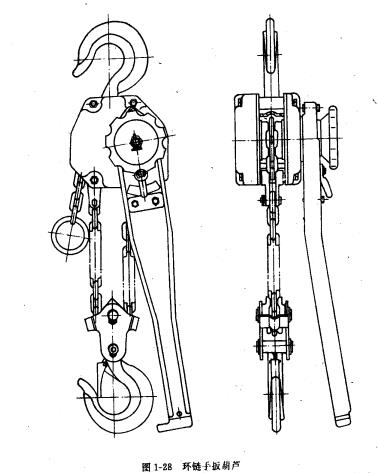 環(huán)鏈?zhǔn)职夂J的結(jié)構(gòu)如圖1-28所示,它采用一級齒輪轉(zhuǎn)動,主要有齒輪軸、齒輪、制動器、起重鏈條、鏈輪、吊鉤、操作手柄等。