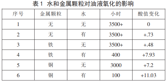 3、加速液壓油性能劣化。固體顆粒尤其是金屬顆粒,還起著催化劑作用,能加速油液氧化,導(dǎo)致其性能下降,如表1所示,為水和金屬顆粒對(duì)液壓油氧化影響實(shí)驗(yàn)的數(shù)據(jù),實(shí)驗(yàn)研究表明,金屬顆粒和水的同時(shí)存在可以家具油液的氧化速度,鐵和銅的催化作用可以使油液的氧化速度分別增加10和30倍以上。