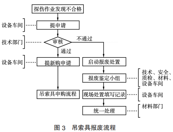 當探傷發(fā)現(xiàn)有不合格吊索具時,由設(shè)備車間提報報廢申請,報技術(shù)部門審核,通過后設(shè)備車間組織報廢鑒定小組進行現(xiàn)場處置并填寫臺賬記錄,同時由材料部門處置并新購。