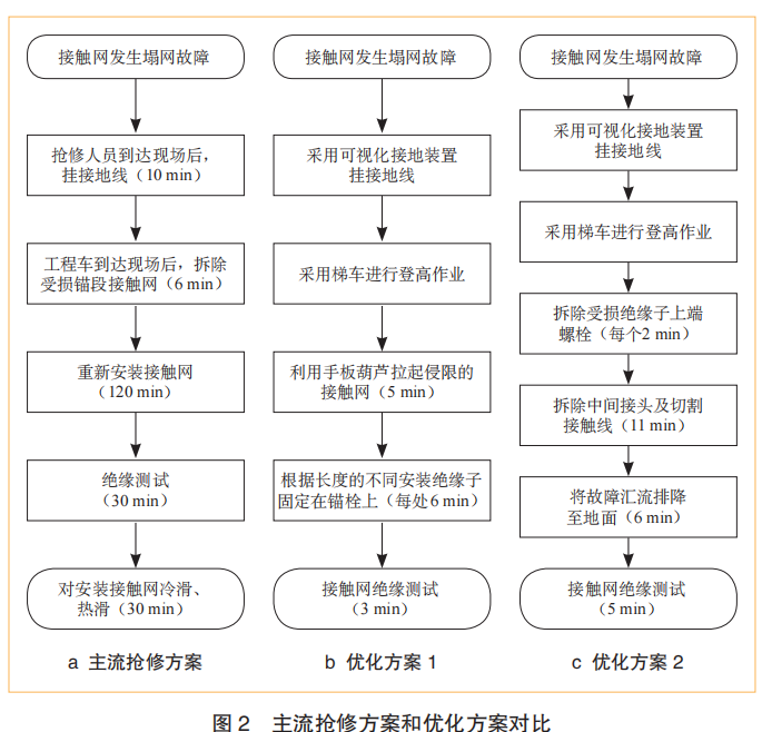 對比主流搶修方案和優(yōu)化后的2種不同的方案,如圖2所示。方案1:假設(shè)發(fā)生接觸網(wǎng)塌網(wǎng)故障,定位化學(xué)錨栓未脫落時,接觸網(wǎng)未斷裂,將侵限的接觸網(wǎng)利用手扳葫蘆拉起。再次固定到懸掛定位上,保證不侵入車輛限界;方案2:接觸網(wǎng)塌網(wǎng)故障造成接觸網(wǎng)斷裂,將故障變形的接觸網(wǎng)進(jìn)行切除。