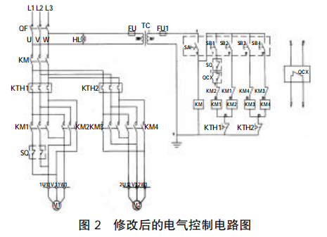 (1)急停開關(guān)不能切斷總電源。解決對策:更改原電動葫蘆的控制電路,增加一個(gè)能斷開總電源的接觸器。急停開關(guān)是帶自鎖的按鈕開關(guān),不能自動復(fù)位。實(shí)施方案:原控制箱的電器元件已老化,箱體內(nèi)無法增設(shè)接觸器。因此,從長遠(yuǎn)考慮,為了保證質(zhì)量,更換電器控制箱是一個(gè)最佳方案。圖 2 為修改后的電氣控制電路圖,KM 是能斷開總電源的接觸器。對于不能更換控制箱的電動葫蘆,必須增加控制電源接觸器。